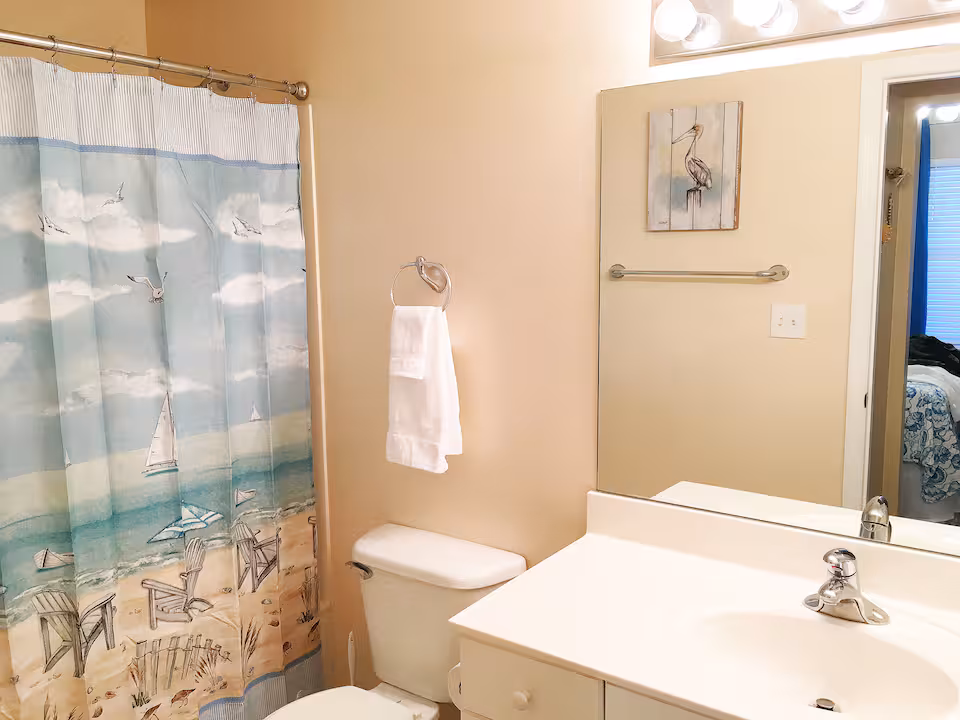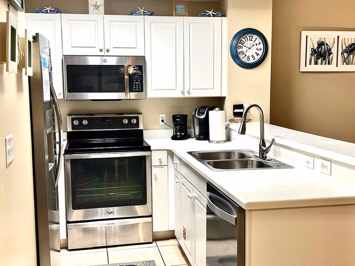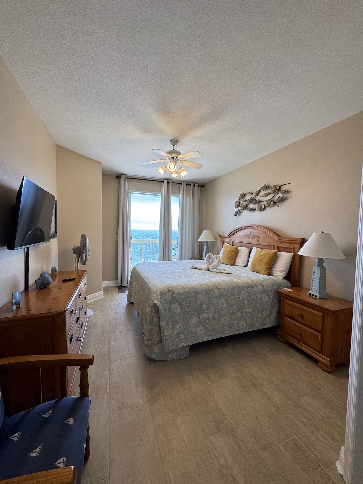 This was an amazing condo to stay in. It’s well appointed and the view! You’re on the 7th floor which is a great location, full beach view from the balcony which has 4 chairs & a table. 2 sliding doors go onto the balcony, 1 in the bedroom & 1 in the living room. Each bedroom has a king bed & its own full bath. The 2nd bathroom is accessible from the hallway too. Kitchen had everything we needed. Good quality cooking pots & pans, coffee pots, crockpot, blender, even measuring utensils so you can really cook comfortably. Elevators were fast & always worked. We never waited. The walkway over the road from the parking garage was safe & nice especially on colder nights. Water pressure is very strong, most appliances seem new & the unit appears recently remodeled.
