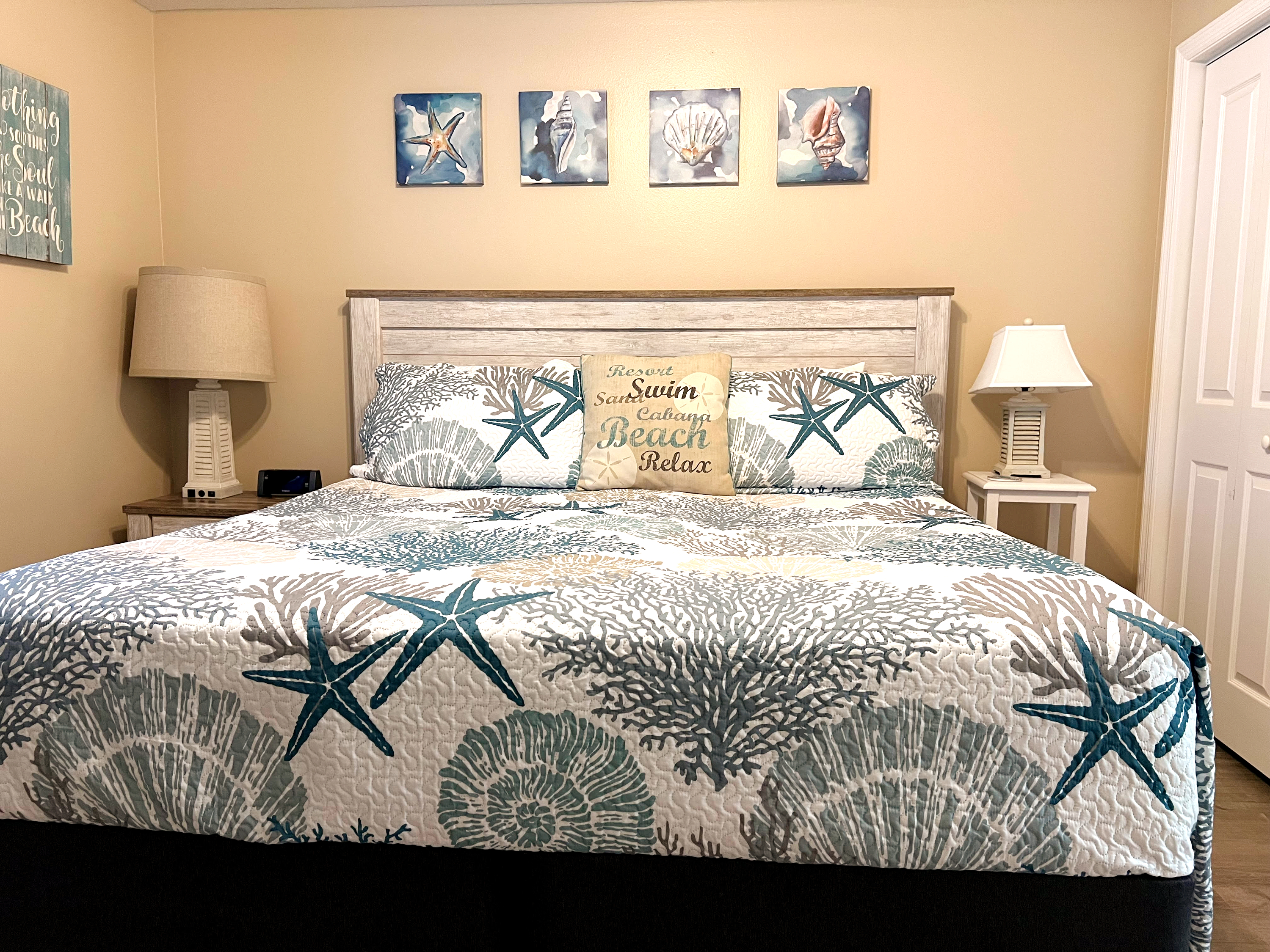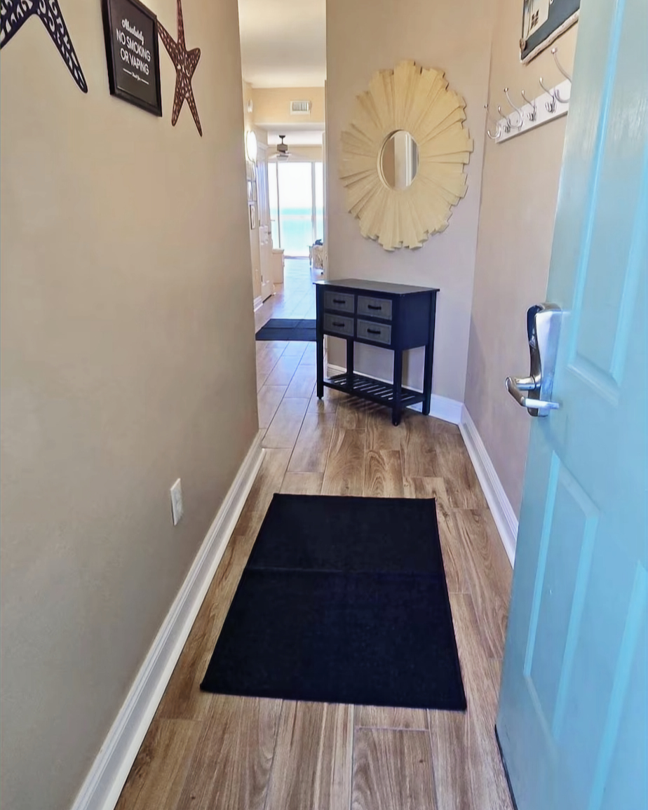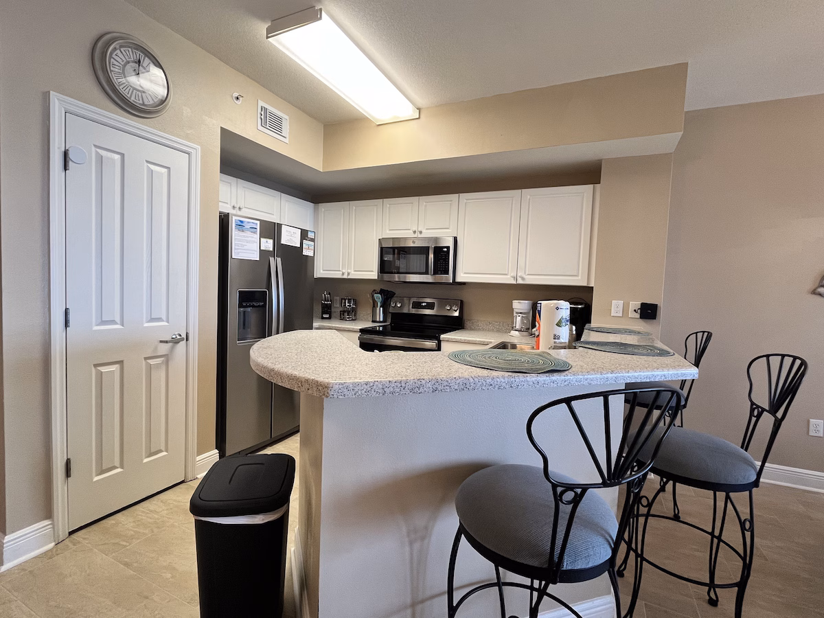 This was an amazing condo to stay in. It’s well appointed and the view! You’re on the 7th floor which is a great location, full beach view from the balcony which has 4 chairs & a table. 2 sliding doors go onto the balcony, 1 in the bedroom & 1 in the living room. Each bedroom has a king bed & its own full bath. The 2nd bathroom is accessible from the hallway too. Kitchen had everything we needed. Good quality cooking pots & pans, coffee pots, crockpot, blender, even measuring utensils so you can really cook comfortably. Elevators were fast & always worked. We never waited. The walkway over the road from the parking garage was safe & nice especially on colder nights. Water pressure is very strong, most appliances seem new & the unit appears recently remodeled.